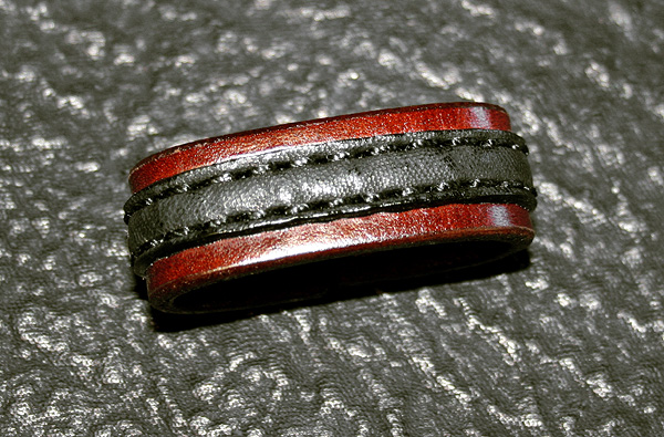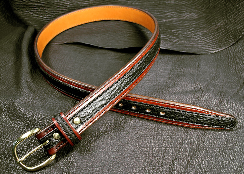 A picture is worth a thousand words... A full shark covered belt is easy to do and not time consuming. A shark trim design is very labor intensive and the look is worth it. We add a highly polished solid brass buckle for a final touch. Available in 1½ wide and up to 48 waist size. Rich reddish-brown color with black shark-trim.