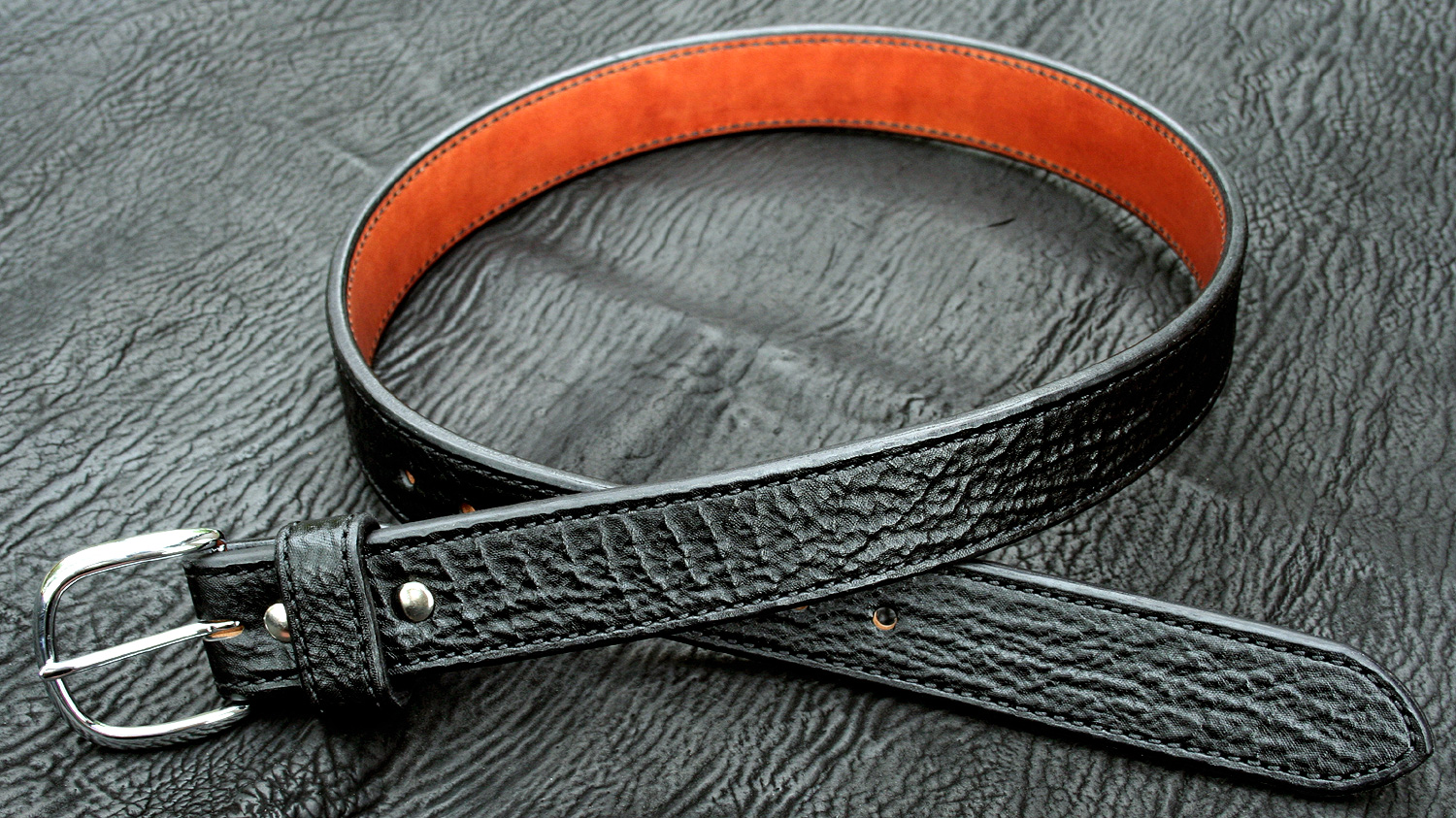 Select grade Black Shark finely stitched onto two thicknesses of top-grade American saddle leather for dress or casual wear. This belt is plenty solid for holster/gun carry and classy enough for dress wear. The final touch is a highly polished solid brass triple-nickle plated buckle. Available in 1 ¼ & 1½ wide and up to 52 waist size.